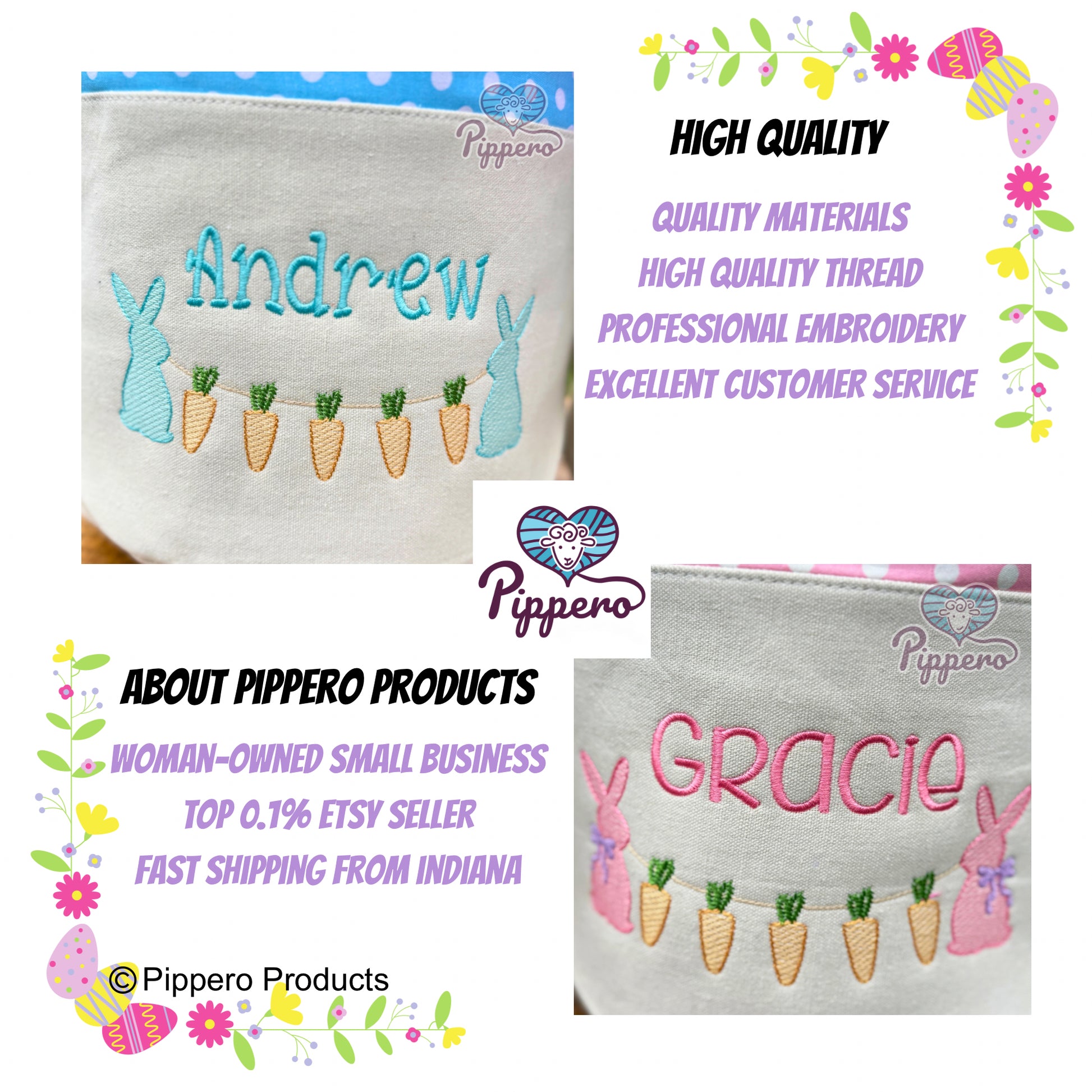 Personalized Easter baskets have a canvas exterior and a soft cloth lining. Name is professionally EMBROIDERED with high quality thread onto the basket for a lifetime of use. Handle is stabilized to stand up but can also be folded down for easy storage and more economical shipping.