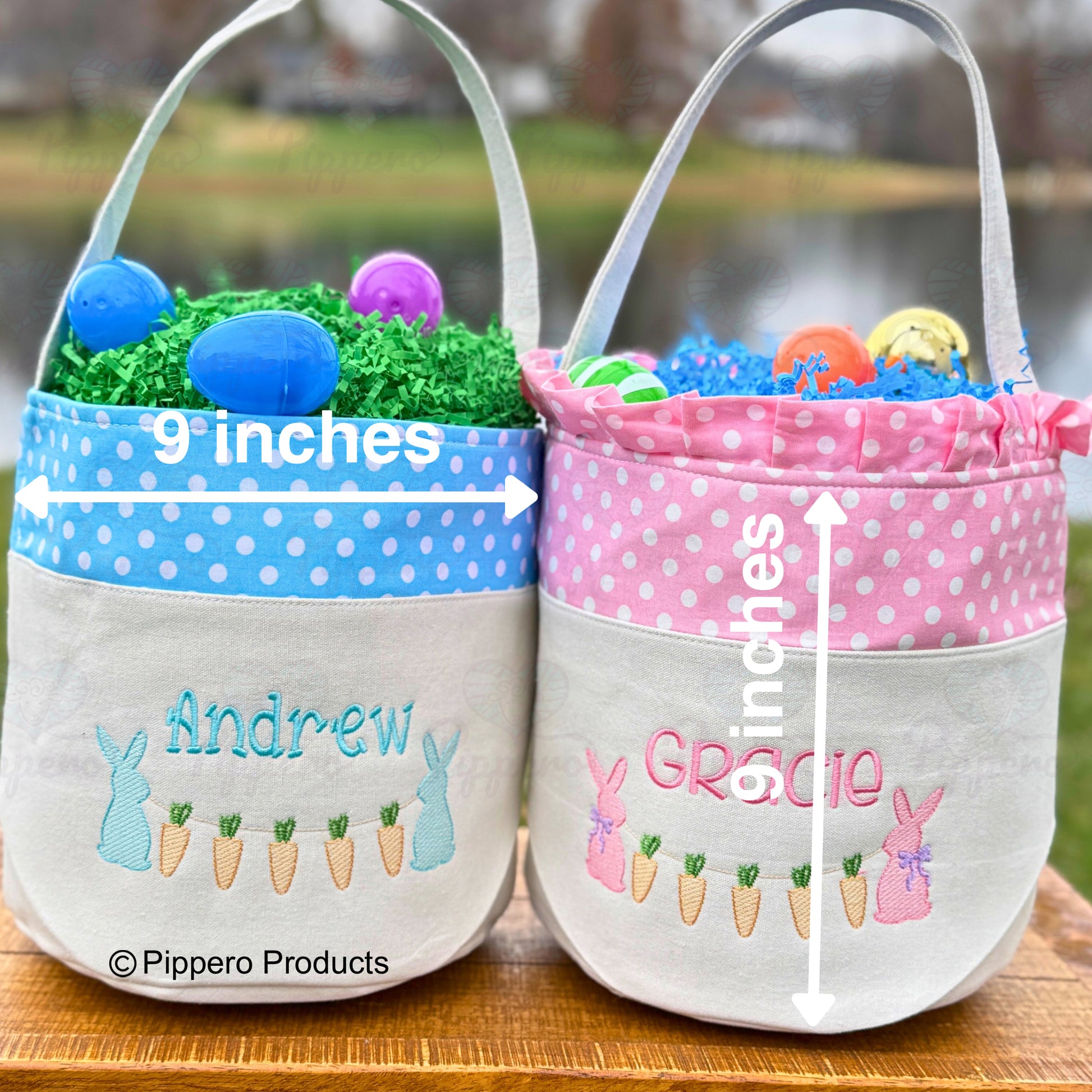 - The Pink and Lavender baskets will have the bunnies with bow design, the Blue and Green baskets with have the bunnies with no bow design.