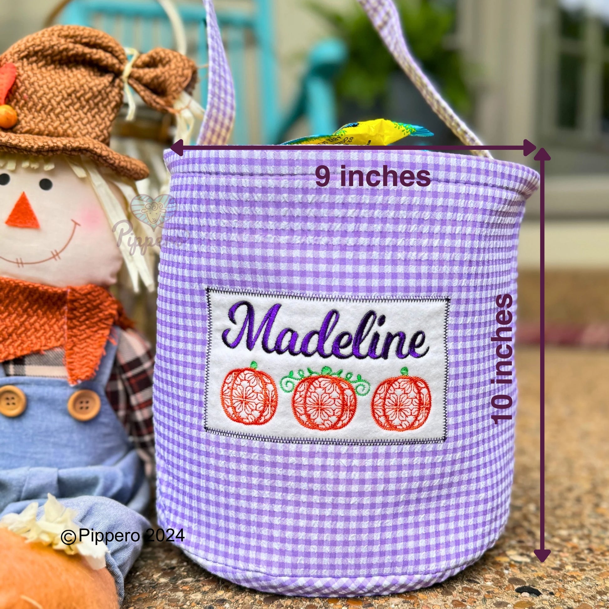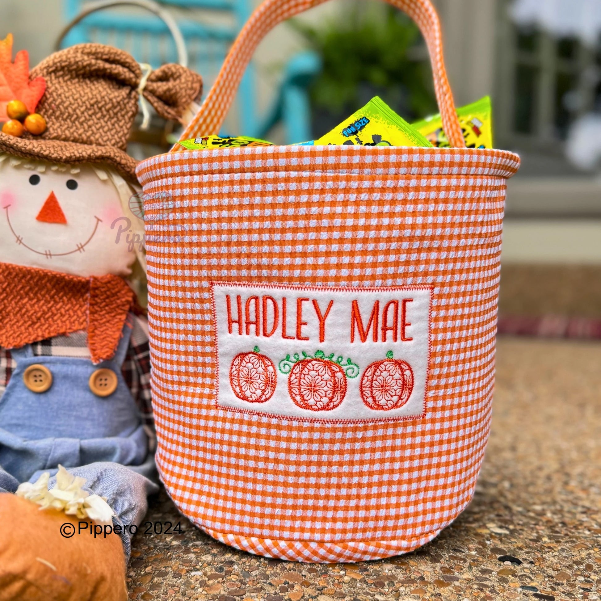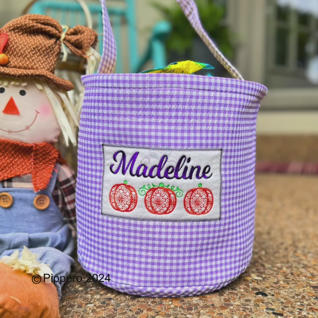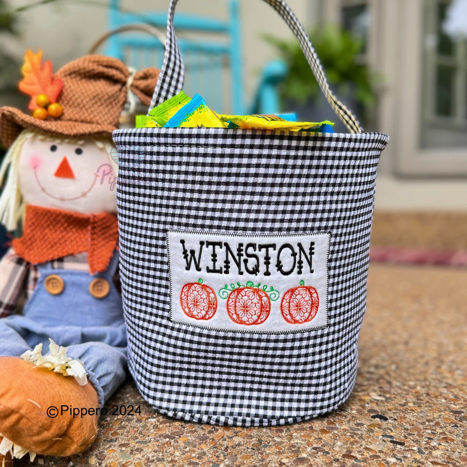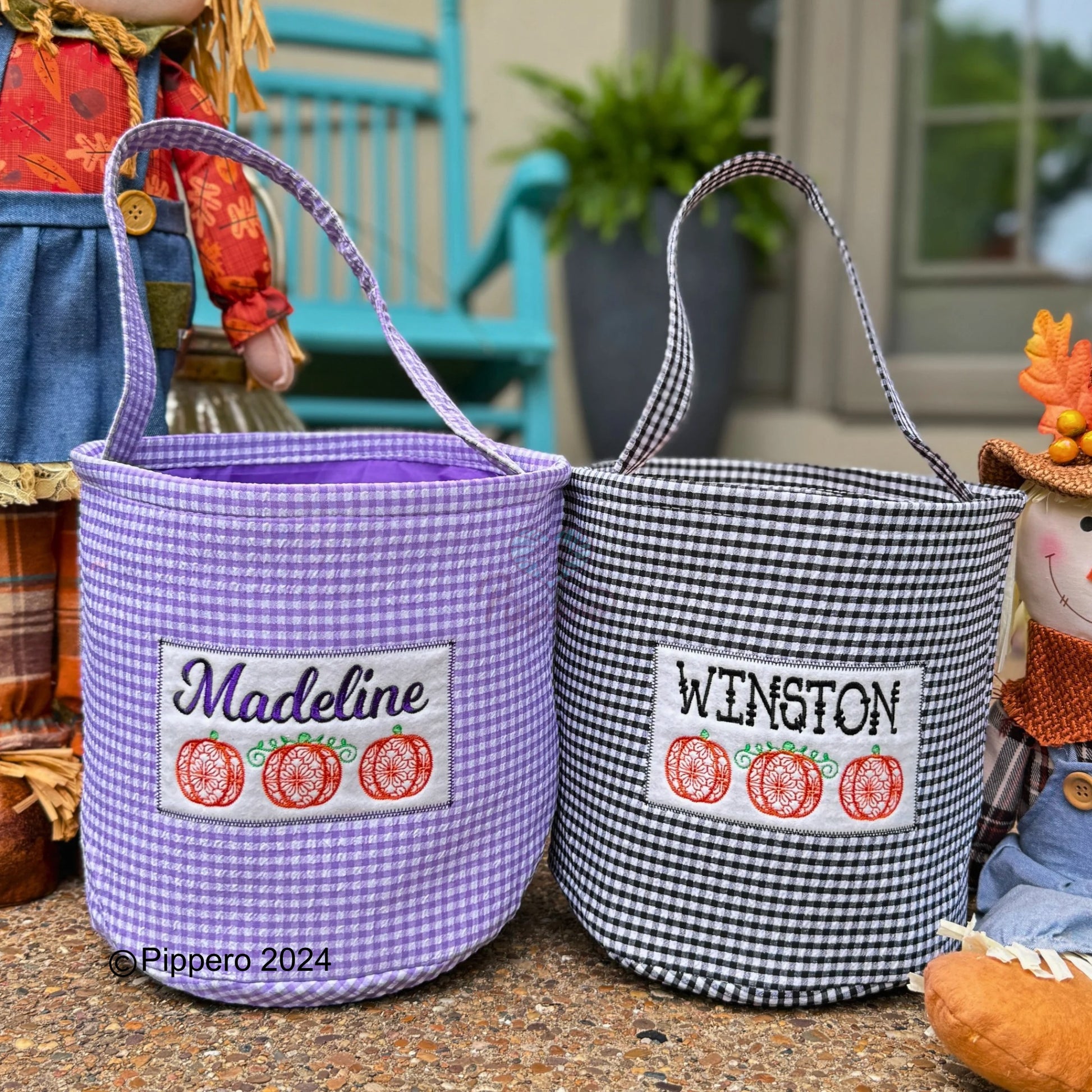 This Personalized Custom Halloween Trick or Treat Basket provides the perfect touch for your kids, grandkids or just special little trick or treaters in your life. This 3 pumpkins design on our Gingham basket is a Pippero custom design and is suitable for church trunk or treat events.