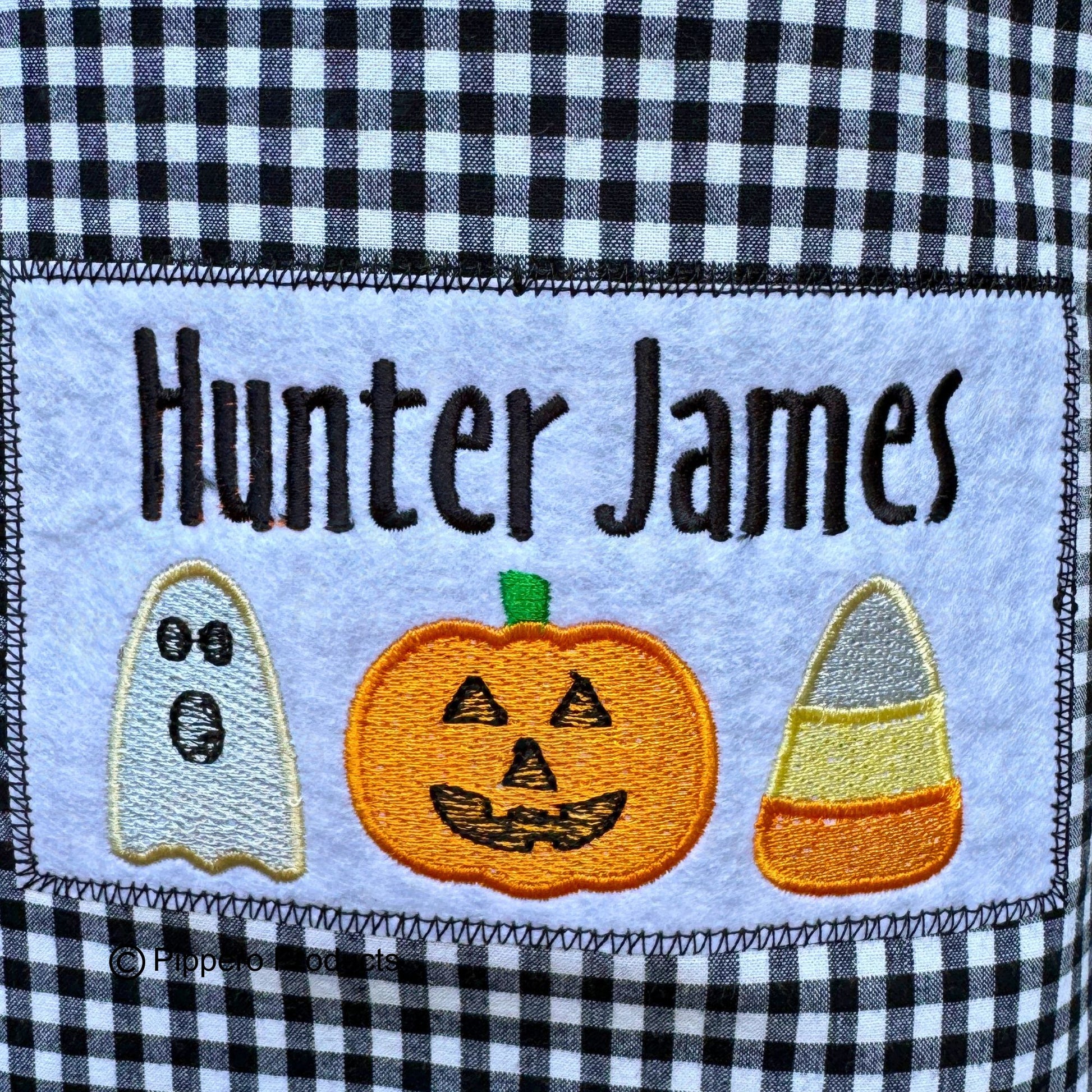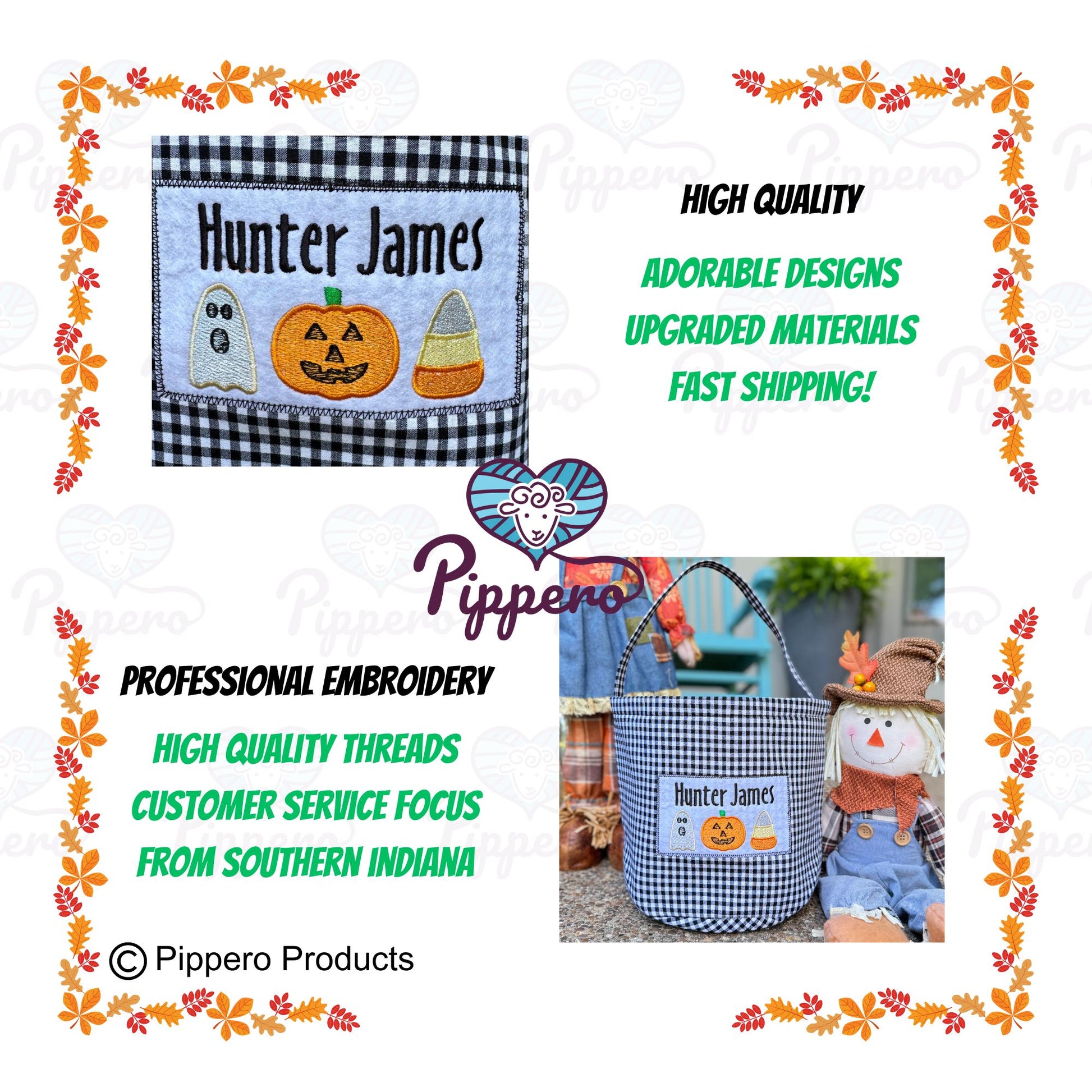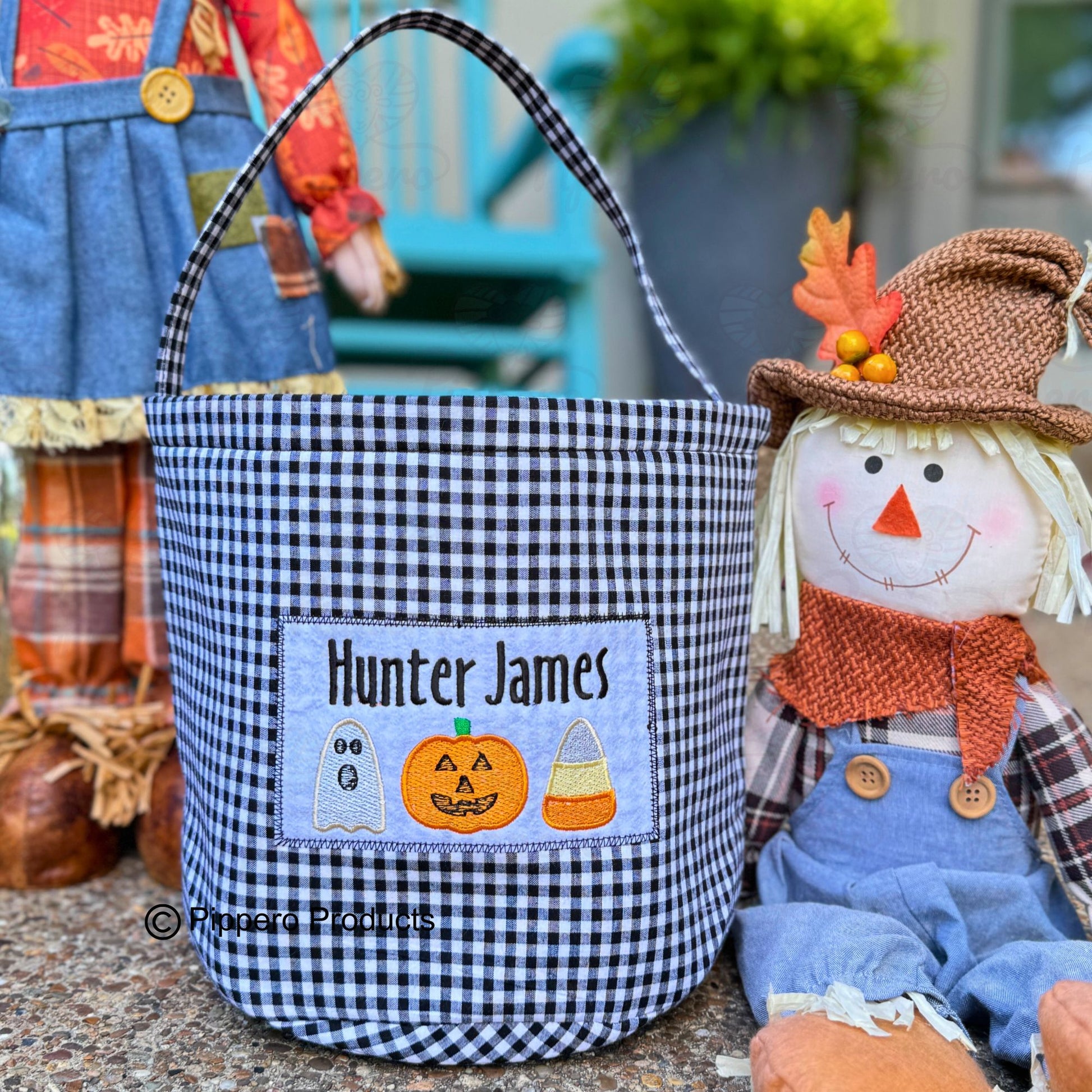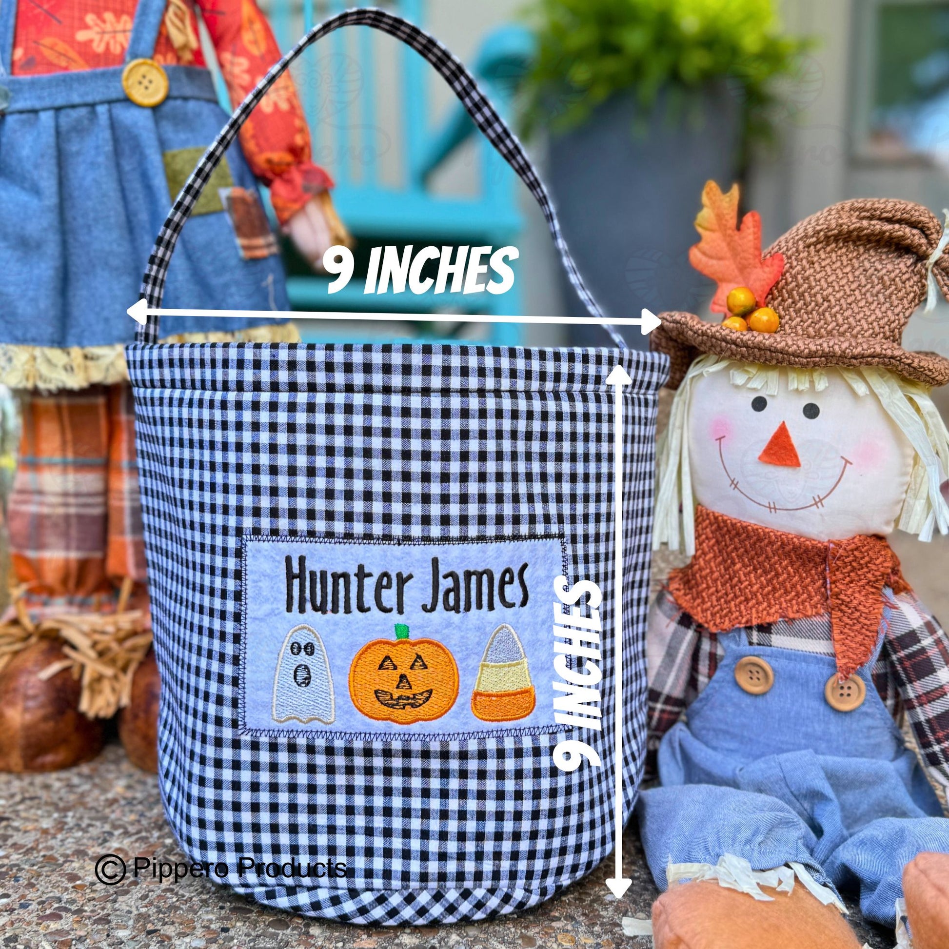 Personalized Embroidered Halloween Trick-or-Treat Candy Basket Gingham Ghost Pumpkin Candy design
